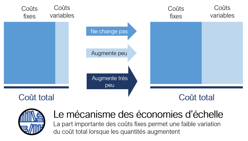 Le concept d’économie d’échelle est un des principes fondamentaux de l’économie. En augmentant le volume de sa production, une entreprise peut répartir ses coûts fixes, c’est-à-dire les coûts supportés quelque soit le niveau de l’activité, sur davantage de produits.