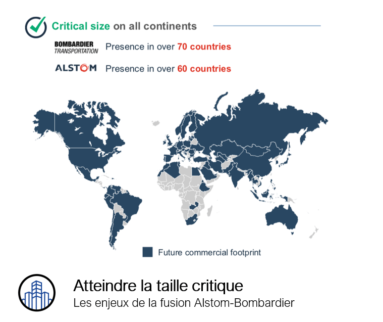 Selon le PDG d’Alstom, la pierre angulaire de cette acquittions serait l’expansion géographique. Les synergies entre Bombardier et Alstom seront certes importantes (400 millions d’euros (d’ici 4 à 5 ans), mais elles resteront toujours en deçà de celles qui étaient prévues par la fusion entre Alstom et Siemens. L’enjeu n’est pas un enjeu de taille, tel démontré par les chiffres, mais un enjeu de présence. Bombardier Transport a une présence dans plus de 70 pays et Alstom, une présence dans 60 pays. Le projet d’acquisition permettra au groupe d’être présent sur tous les continents et lui permettra également, à terme, d’acquérir une présence forte dans des marchés stratégiques en croissance. D’ici 2024, le Royaume Uni investira l’équivalent de 40 milliards d’euros dans des projets d’infrastructure ferroviaire. Il en est de même pour l’Allemagne et la Suède qui investiront 86 milliards d’euros d’ci 2030. Il faut bien souligner qu’il existe une complémentarité entre les 2 entreprises. 60% des revenus seront réalisés en Europe, mais les activités des deux n’entrent pas en collision, et c’est exactement cela qui fait la force de l’acquisition. Des capacités industrielles seront acquises dans les régions stratégiques mentionnées. Digne d’une multinationale canadienne, Bombardier a des usines dans tous les pays de l’ALENA, et produit aussi bien des véhicules ferroviaires que des components. En Chine, la gamme de produit est encore plus large, étant donné que tous les biens de la chaîne de production y sont produits. Les géographies non couvertes par Bombardier Transport le sont par Alstom. Alstom pourra donc étendre sa position sur les marchés émergents et dynamiques tels que l’Allemagne, l’Amérique du Nord, le Royaume Uni et notamment la Chine.