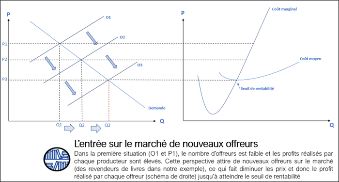 Les années 1970 marquent l’entrée des grandes surfaces sur le marché du livre (notamment la FNAC en 1974). Ces nouveaux acteurs font automatiquement baisser les prix, selon la loi de l’offre et de la demande. L’incitation à entrer sur le marché est en effet très forte et perdure tant que le prix du marché est supérieur au coût moyen pour l’entreprise (ce qu’on appelle le seuil de rentabilité). En dessous de ce seuil, l’entreprise réalise des pertes. Le graphique ci-dessous nous montre que grâce à la libre concurrence, les prix sont les plus bas possibles et le niveau de production est le plus élevé possible, les offreurs entrant sur le marché en continu jusqu’à ce que le profit de chaque producteur soit nul. Les prix des livres ont donc forcément eu tendance à baisser drastiquement avec l’entrée de nouveaux acteurs sur le marché.