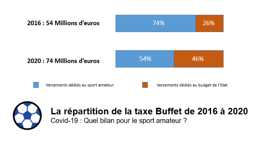 Autre pan du plan de relance : l’allongement de la taxe Buffet. Cette taxe permet au sport amateur et à l’Etat de toucher une partie des droits télévisés du sport professionnel. Avec l’arrivée de Mediapro, cette taxe Buffet, fixée à 5%, est passée de 54 millions en 2016 à près de 74 millions en 2020. Seul hic, malgré une augmentation de 20 millions d’euros des revenus perçus grâce à la taxe, les montants versés aux clubs amateurs sont restés stables autour des 40 millions. C’est le budget sport de l’Etat qui a bénéficié de la hausse des droits télévisés.