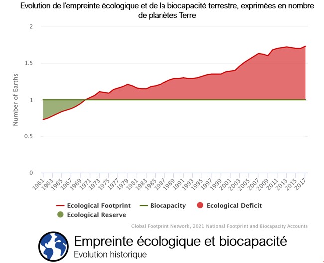 Or aujourd’hui ces hypothèses ne sont pas respectées. Selon l’ONG Global Footprint Network, le jour du dépassement mondial est le 22 août 2020, c’est le jour où l’humanité a dépensé l’ensemble des ressources que la Terre peut régénérer en un an. Autrement dit, c’est le jour où l’empreinte écologique dépasse la biocapacité de la planète (capacité de la Terre à régénérer les ressources renouvelables).