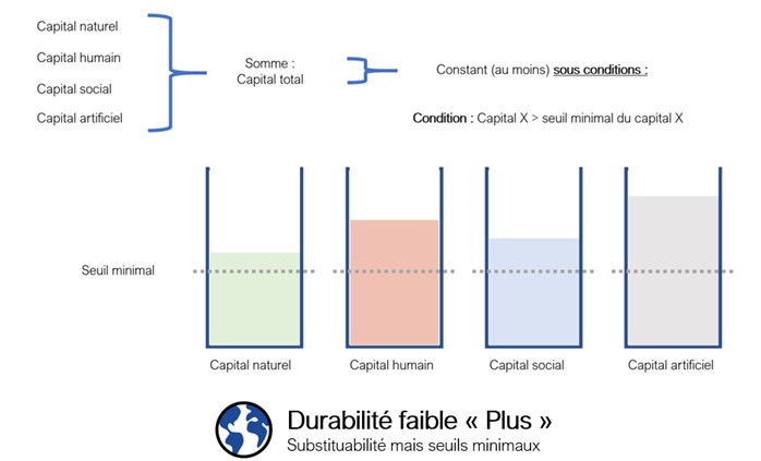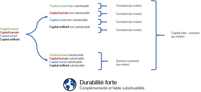 La question qui se pose alors est de savoir si ces capitaux sont substituables entre eux (ie interchangeables), afin de connaître dans quelle mesure une baisse d’un capital peut être compensée par la hausse d’un autre. Sur cette hypothèse de substituabilité se distingue trois visions de la durabilité : durabilité faible, durabilité forte et durabilité faible plus.