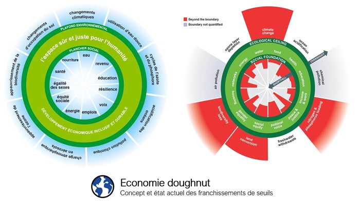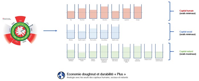 Le parallèle entre durabilité faible plus et économie doughnut s’explique par le fait que Kate Rayworth décompose le capital humain et le capital social en plusieurs composantes possédant des seuils critiques, et le capital naturel en composantes possédant des seuils maximaux.