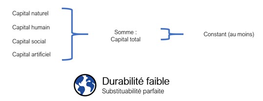 L’hypothèse de durabilité faible suppose que les capitaux sont parfaitement substituables. Ainsi peut-on remplacer du capital naturel par du capital artificiel (créé par l’homme). Autrement dit, l’humanité peut dégrader son environnement via l’épuisement des ressources ou l’érosion des services écosystémiques du moment qu’elle lègue aux générations futures davantage de capital créé par l’homme (machines, infrastructures) qui compense ces pertes de capital naturel.