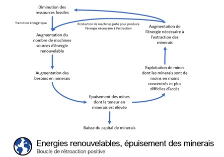 En parallèle, on peut relever une relation forte entre épuisement des minerais et production d’énergie puisque les ressources fossiles s’épuisent donc les énergies fossiles sont peu à peu remplacées par des énergies renouvelables, dynamique encouragée par les objectifs climatiques de baisse des émissions de GES. En effet, selon l’Agence Internationale de l’Energie (AIE), le pic de pétrole conventionnel a été atteint en 2008 au point qu’elle estime qu’il faudrait multiplier par 2 ou 3 la production de pétrole de schiste pour empêcher la baisse mondiale de production pétrolière d’ici 2025.