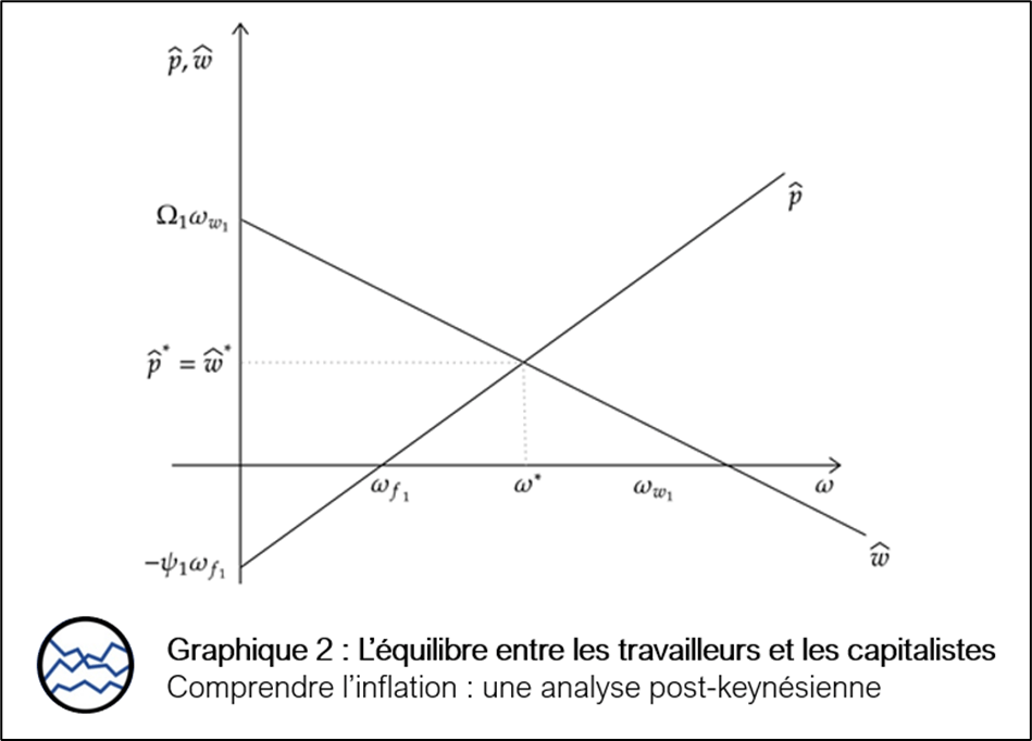 Lecture : Le taux d’inflation (p^) et le taux d’évolution des salaires (w^) sont à l’équilibre lorsque les deux droites se coupent.